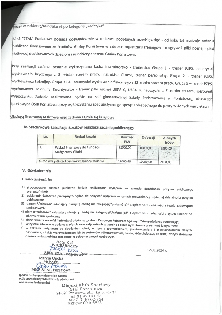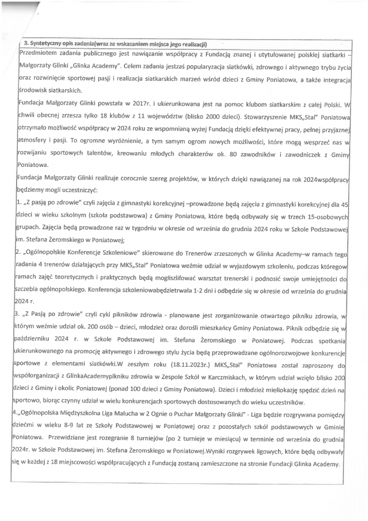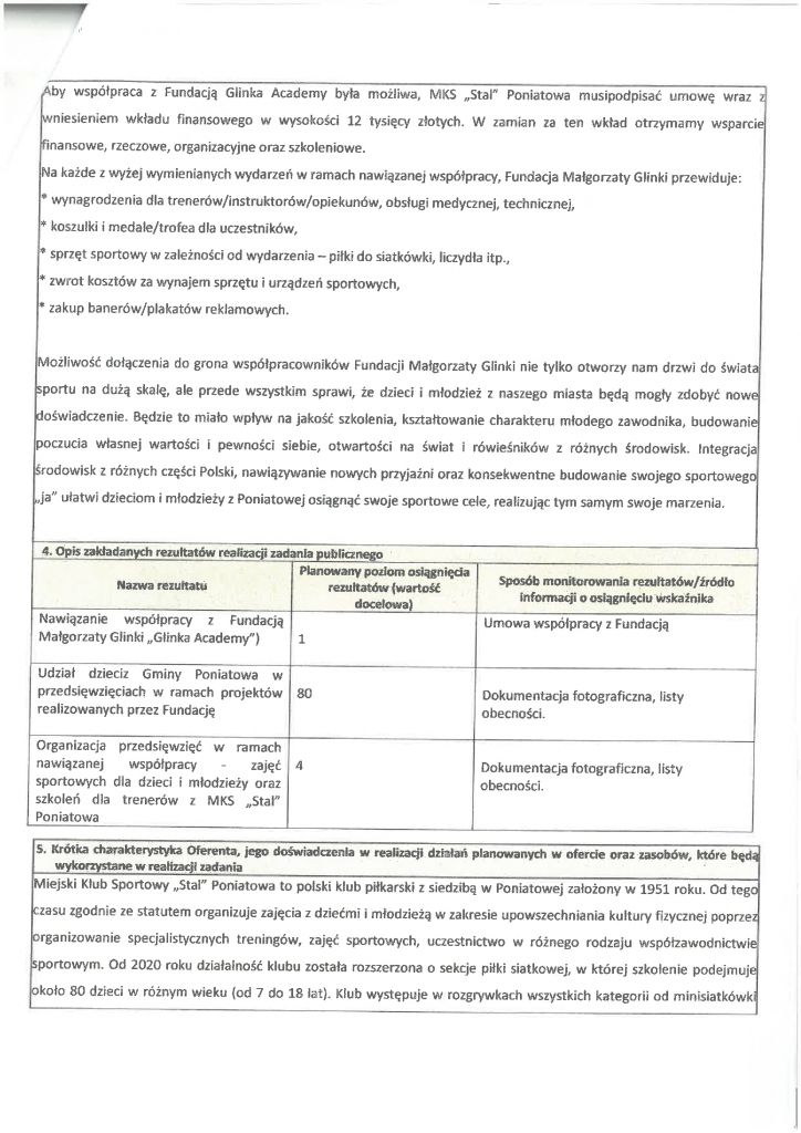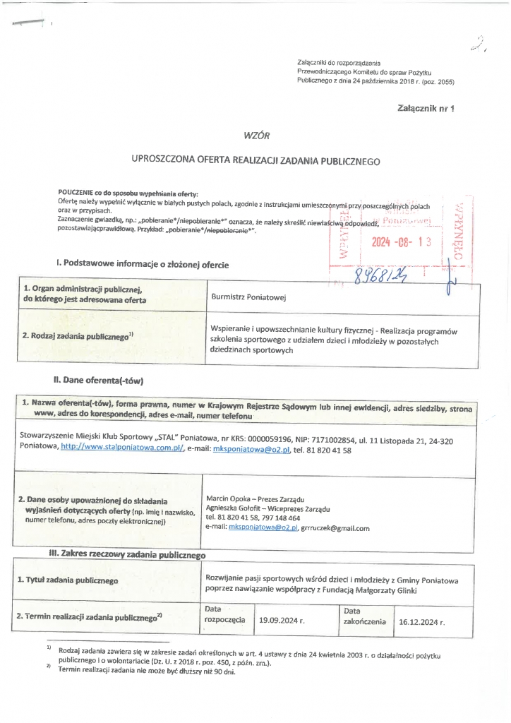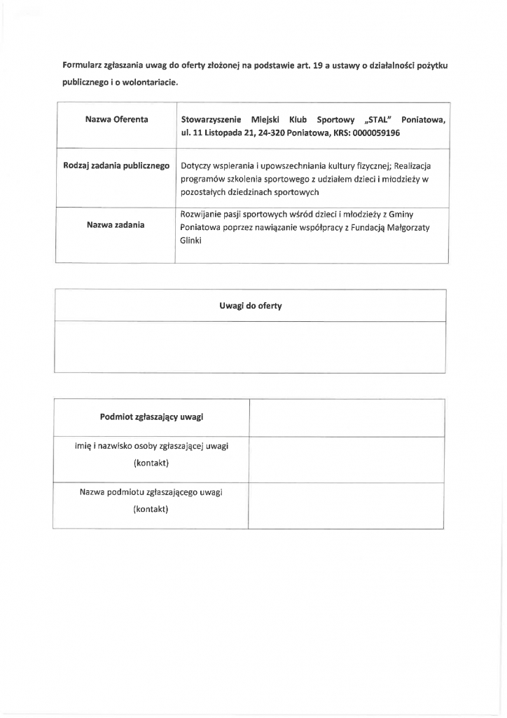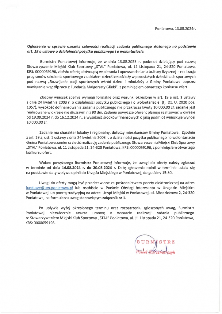 Ogłoszenie w sprawie uznania celowości realizacji zadania publicznego złożonego na podstawie art. 19 a ustawy o działalności pożytku publicznego i o wolontariacie – MKS Stal Poniatowa