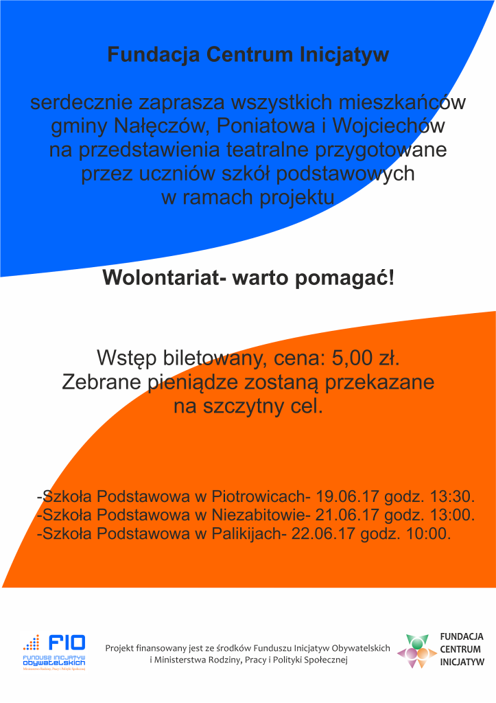 Serdecznie zapraszamy na charytatywne przedstawienia w ramach projektu „Wolontariat- warto pomagać!”. Przedstawienia odbędą się w Szkołach Podstawowych w Palikijach, Piotrowicach i Niezabitowie. W trakcie wydarzenia uczniowie pokażą przygotowane przez nich przedstawienia oraz filmy, które powstały na zajęciach projektowych. Wydarzenie ma charakter charytatywny: w trakcie przedstawienia zbierane będą datki na Szpital Dziecięcy w Lublinie, Schronisko dla Bezdomnych Zwierząt w Puławach lub Hospicjum Małego Księcia. Przedstawienia odbędą się: 19 czerwca o godz. 13.30 w Szkole Podstawowej im. Adama Mickiewicza w Piotrowicach, 21 czerwca o godz. 13.30 w Szkole Podstawowej im. Ewy Szelburg-Zarembiny w Niezabitowie oraz 23 czerwca o godz. 10.00 w Szkole Podstawowej w Palikijach. Zapraszamy serdecznie wszystkich zainteresowanych. Projekt „Wolontariat- warto pomagać!” finansowany jest przez Fundusz Inicjatyw Obywatelskich i realizowany przez Fundację Centrum Inicjatyw.
