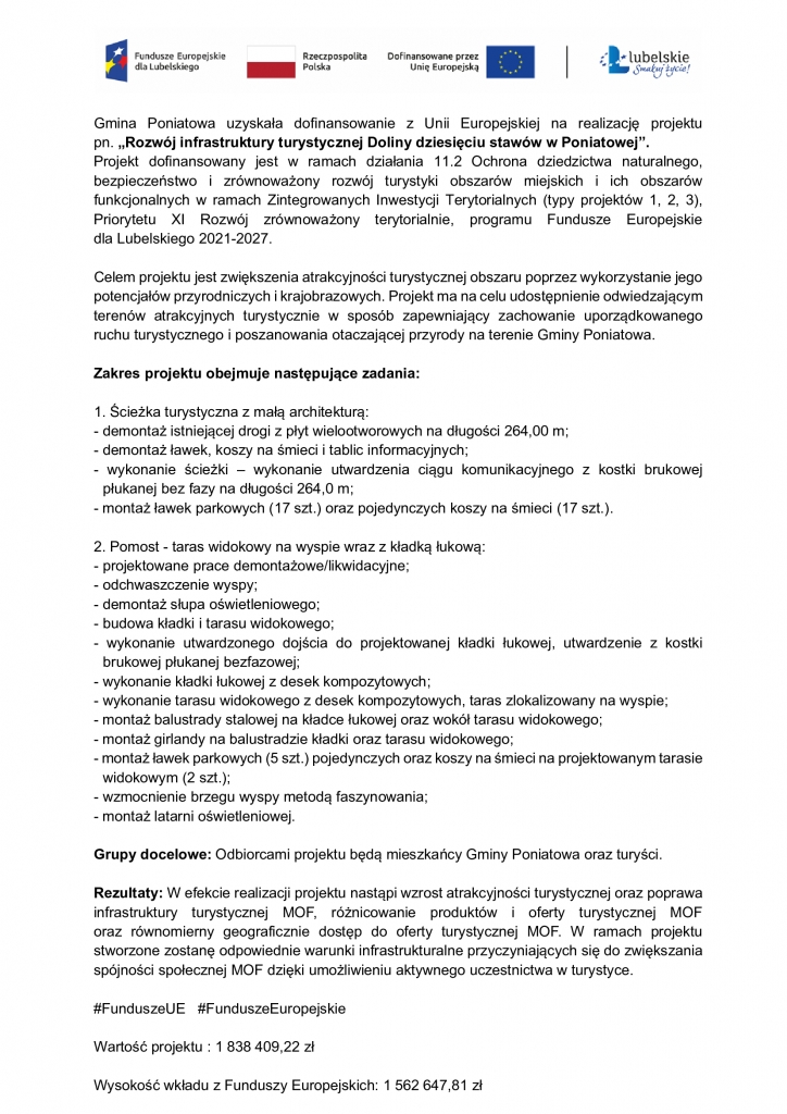 Gmina Poniatowa uzyskała dofinansowanie z Unii Europejskiej na realizację projektu pn. „Zachowanie walorów przyrodniczych Doliny dziesięciu stawów w Poniatowej”. Projekt dofinansowany jest w ramach działania 3.11 Ochrona bioróżnorodności w ramach Zintegrowanych Inwestycji Terytorialnych Miejskich Obszarów Funkcjonalnych (typ projektu 1-8), Priorytetu III Ochrona zasobów środowiska i klimatu.