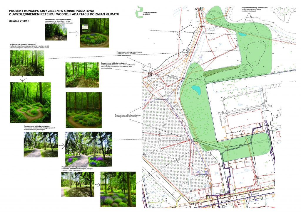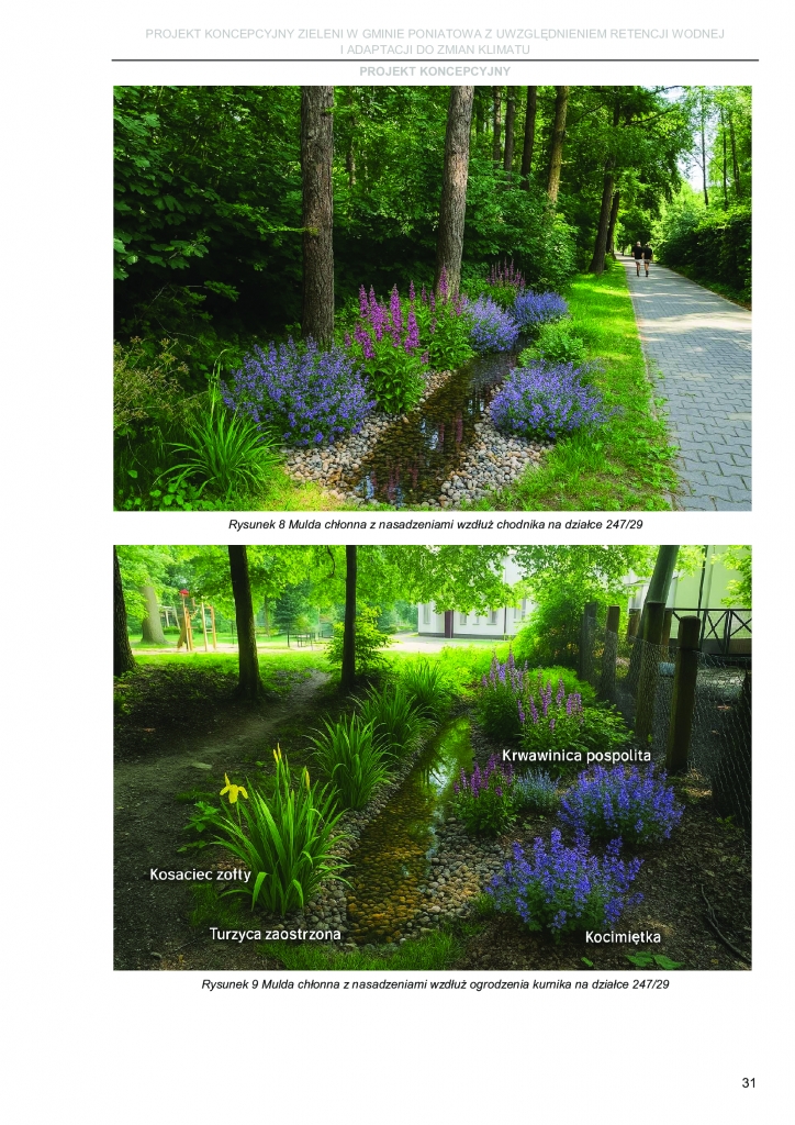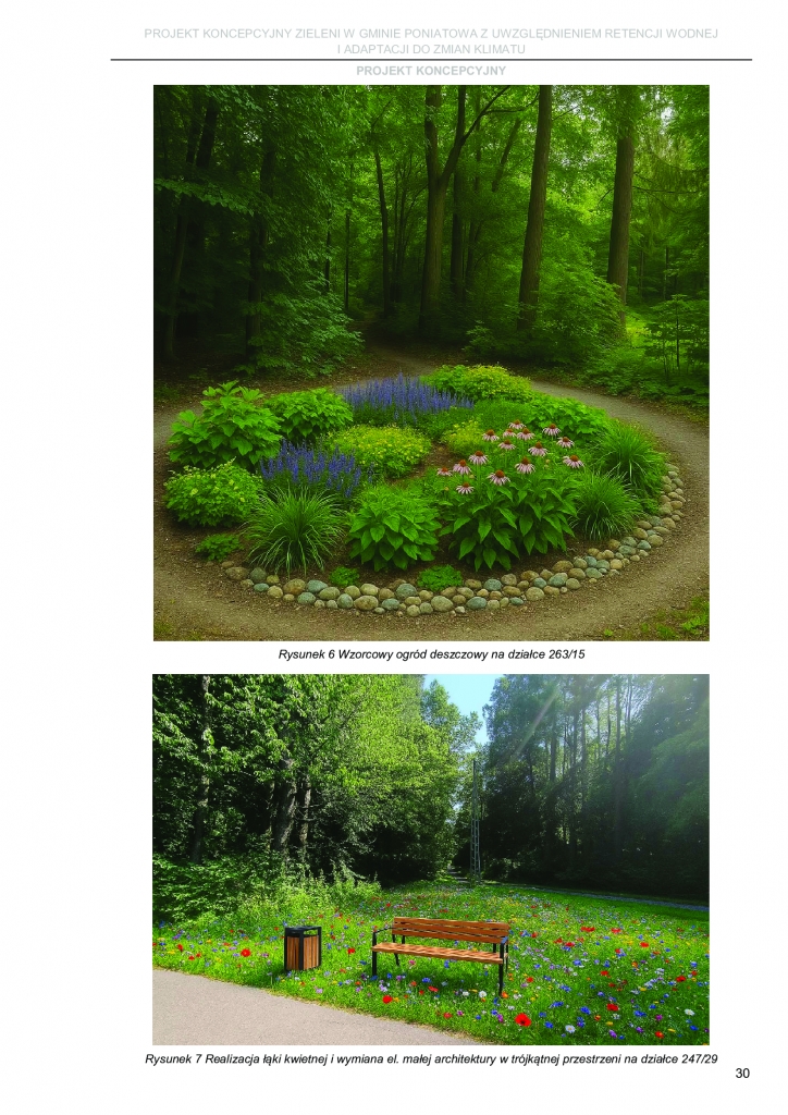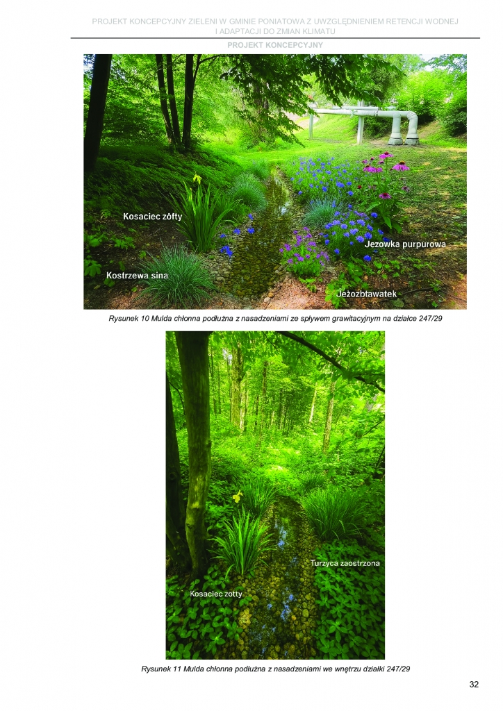 Ostatnim etapem realizacji projektu było opracowanie dokumentu pod nazwą: Projekt koncepcyjny zieleni w Gminie Poniatowa z uwzględnieniem retencji wodnej i adaptacji do zmian klimatu, który nawiązuje i uzupełnia Miejski Plan Adaptacji do Zmian Klimatu dla Poniatowej. Poniżej przedstawiamy stworzony dokument, z którym możecie się Państwo zapoznać. Propozycji działań z zakresu adaptacji do zmian klimatu, w tym: zastosowania rozwiązań retencyjnych (ogrody deszczowe, zbiorniki retencyjne, muldy chłonne, zielone dachy/ściany, systemy rozsączające), zwiększenia chłonności terenu i zatrzymywania wód opadowych, zwiększenia odporności terenów miejskich na fale upałów.